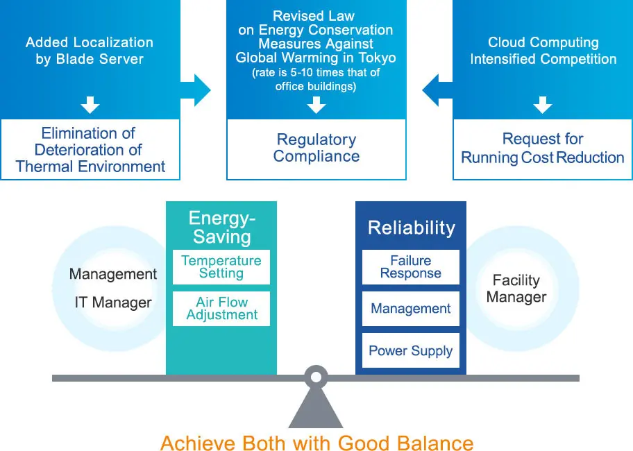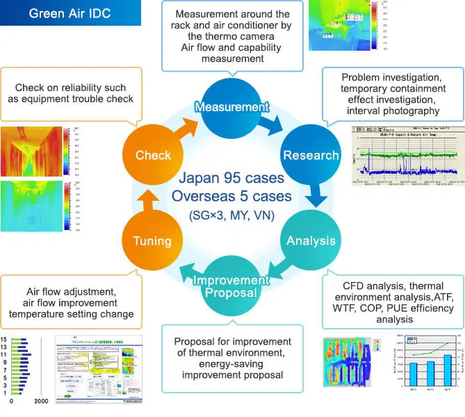 Green Air IDC es un servicio operativo para la optimización integral a lo largo del ciclo de vida de un centro de datos (IDC). En un IDC, la carga del sistema de aire acondicionado varía en intervalos cortos debido a la incorporación o sustitución de equipos informáticos. Diagnosticamos el entorno térmico y energético en condiciones operativas del IDC, y proporcionamos desde ajustes para ahorro de energía hasta planificación y diseño general para renovación, construcción y servicio postventa, todo en un único paquete integral. Contamos con más de 100 casos de validación tanto en Japón como en el extranjero.