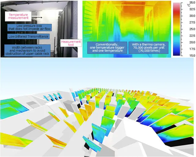 Como parte de nuestro servicio, realizamos simulaciones mediante análisis CFD, pero además visualizamos la distribución de temperatura convirtiéndola en 3D con una cámara térmica y un filtro especial, basándonos en mediciones reales del entorno de la sala de servidores para que los ingenieros de TI puedan comprender fácilmente la situación.