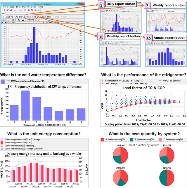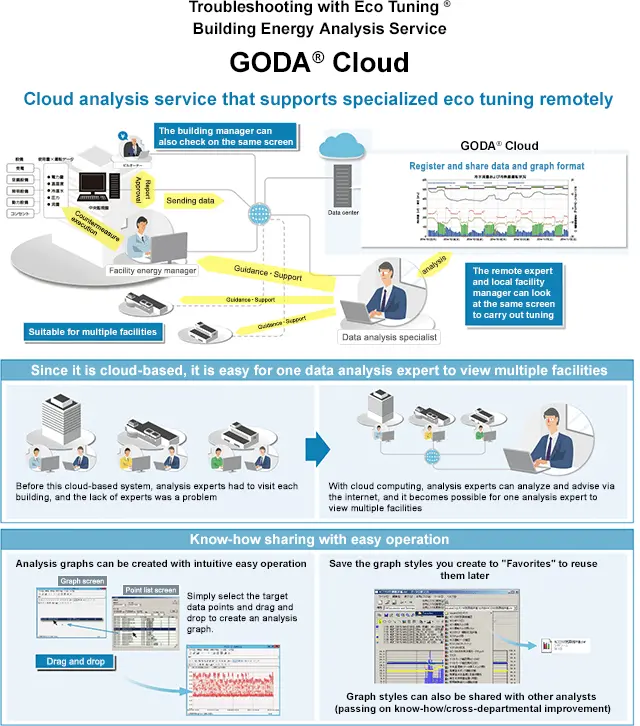 GODA® Cloud es una herramienta de recopilación y análisis de datos que captura información de operación en el equipo de monitoreo central de un edificio, analiza la operación desde múltiples ángulos en poco tiempo y permite una operación óptima de ahorro de energía.