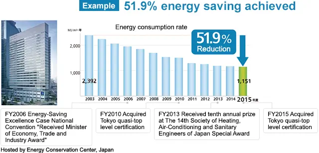 El edificio Panasonic Tokyo Shiodome ha estado utilizando ajustes de ahorro energético aprovechando al máximo esta herramienta desde 2003, y ha logrado un ahorro de energía del 51.9% (año fiscal 2015) en comparación con el primer año tras la finalización de la construcción.
